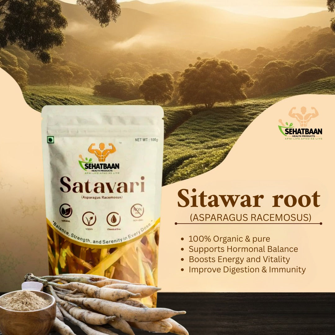 Sehatbaan Satavari (Sitawar Root) is a 100% organic and pure herbal supplement made from Asparagus Racemosus. Known for its rejuvenating properties, it supports hormonal balance, boosts energy, enhances vitality, and promotes digestive health. A natural choice for overall well-being and immunity enhancement.
